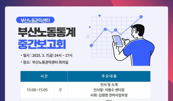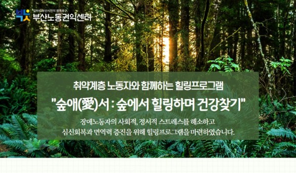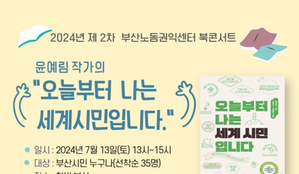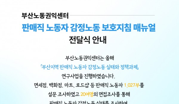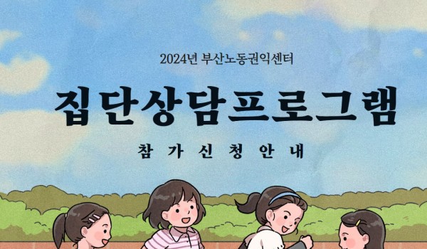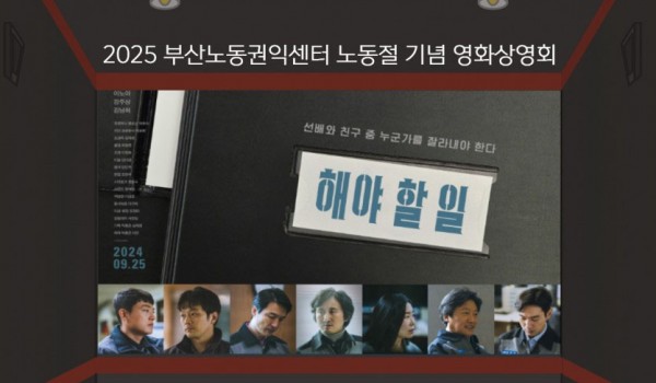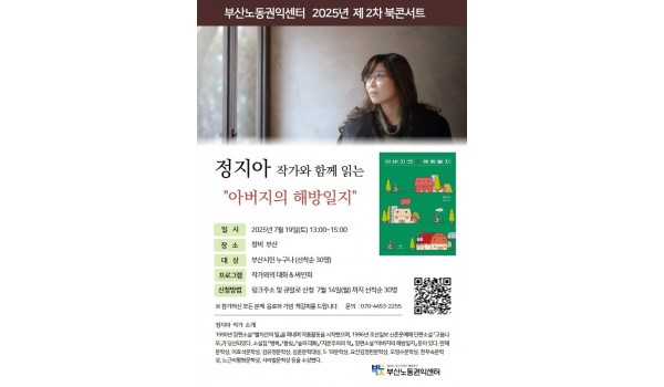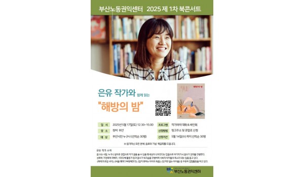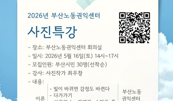 2026년 부산노동권익센터 사진특강 <빛으로 인물 담기> 2026년 사진특강 “빛으로 인물 담기”부산노동권익센터가 매년 노동사진공모전을 앞두고 진행되는 사진특강!올해는 최우창 사진.. 최고관리자 04-14 61 2026년 노동절영화제 “노동절 즐기기” 2026년 노동절영화제 “노동절 즐기기”‘근로자의 날’을 ‘노동절’로 변경(2026년부터, 62년 만에 명칭이 복원됨)노동.. 최고관리자 04-01 137 끼인세대를 위한 노동회복프로그램 “지친 마음에 힐링을, 끼인 세대에 위로를”끼인세대를 위한 노동회복프로그램 신청부산노동권익센터는 경제활동을 통해 사회에 기.. 부산노동권익센터 02-23 375 [10월 북앤토크] 왜 좋은 일자리는 늘 부족한가 왜 좋은 일자리는 늘 부족할까요. 잘 모르겠습니다. 궁금하기도 합니다. 자리가 그다지 많지 않습니다. 서둘러 신청해주세요... 부산노동권익센터 09-25 409 SUNDAY TALK 현장의 목소리 https://moaform.com/q/BS_labor_roundtable 부산노동권익센터 09-09 405 2025 부산노동권익센터 제3차 북콘서트 -표명희 작가와 함께 읽는 "어느날 난민", "버샤" 신청하기https://moaform.com/q/xAStl0 부산노동권익센터 08-29 427 2025년 제2차 부산노동권익센터 북콘서트 - 정지아 작가와 함께 읽는 "아버지의 해방일지" 북콘서트 참가신청 (아래 링크를 클릭하세요!) https://moaform.com/q/ZWx0fC 부산노동권익센터 07-01 541 2025년 제1차 부산노동권익센터 북콘서트 - 은유작가와 함께 읽는 "해방의 밤" 참가신청https://moaform.com/q/P5HaEn 최고관리자 05-07 771 2025 부산노동권익센터 노동절 기념 영화상영회 "해야 할 일" 신청하기(링크클릭)bit.ly/25노동영화 부산노동권익센터 04-09 922 부산노동통계 중간보고회 부산노동권익센터 03-05 716 2025년 감정·비정규 노동 커뮤니티(모임) 지원 사업 2025년 감정·비정규 노동 커뮤니티(모임) 지원 사업 부산노동권익센터 02-07 1245 2024 네트워크 기관과 함께하는 노동존중문화 확산 활동 "괴롭힘은 거리두기 존중은 곁에두기" 부산노동권익센터 01-06 779 2024년 부산노동권익센터 감정·비정규 노동자 권리증진 교류회 안내 감정·비정규 노동자 권리증진 교류회 안내감정노동자와 비정규직 노동자들이 함께 모여 서로의 경험을 나누고, 연대와 힐링의 시.. 부산노동권익센터 11-14 833 판매직 노동자 감정노동 보호지침 매뉴얼 전달식 안내 부산노동권익센터 11-11 853 2024년 제3차 부산노동권익센터 북콘서트 - 조해진 작가 <로기완을 만났다> 2024년 제3차 부산노동권익센터 북콘서트<로기완을 만났다>-일시 : 2024.10.12.(토) 13~15시-장.. 부산노동권익센터 09-24 983 2024년 부산노동권익센터 집단상담 프로그램 [24년 부산노동권익센터 집단상담 프로그램]삶을 살아내는 것에 집중하느라, 자신을 돌보는 시간을 놓치진 않고 있나.. 부산노동권익센터 08-01 1046 2024년 제2차 부산노동권익센터 북콘서트 - 윤예림 작가 <오늘부터 나는 세계시민입니다> 신청 링크 https://moaform.com/q/vcuIxY 부산노동권익센터 06-26 1111 취약계층 노동자와 함께하는 힐링프로그램 "숲애(愛)서" 부산노동권익센터 05-27 1101 2024 부산노동권익센터 노동절 영화상영회 - 나의 올드오크 신청하기 (링크 클릭) bit.ly/24노동절영화 부산노동권익센터 04-15 1518 2024년 부산노동권익센터 집단상담 프로그램 부산노동권익센터 02-15 1632 열린1페이지 2페이지 맨끝