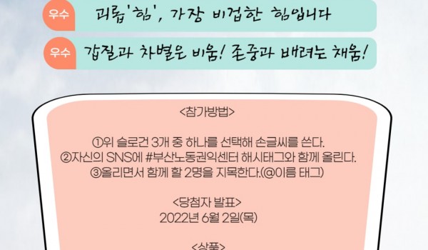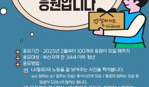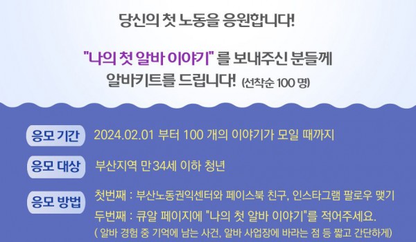 캠페인 이벤트 온라인 캠페인 이벤트 2025 김알바가 선물하는 알바키트 당신의 첫 노동을 응원합니다![김알바가 선물하는 알바키트] ✔부산노동권익센터가 첫 노동을 시작하는 청년을 응원합니.. 부산노동권익센터 02-10 895 이벤트 2024 당신의 첫 노동을 응원합니다 <알바키트> 당신의 첫 노동을 응원합니다![김알바가 선물하는 알바키트] ✔부산노동권익센터가 첫 노동을 시작하는 청년을 응원합니.. 부산노동권익센터 02-01 1894 이벤트 2023 김알바가 선물하는 알바키트 당신의 첫 노동을 응원합니다!부산노동권익센터의 "당신의 첫 노동을 응원합니다" 김알바가 선물하는 #알바키트 올해도 찾아갑니.. 부산노동권익센터 04-07 1381 이벤트 [당첨자 발표] 김알바가 선물하는 알바키트 부산노동권익센터 03-24 1323 이벤트 김알바가 선물하는 알바키트 당신의 첫 노동을 응원합니다![김알바가 선물하는 알바키트] 부산노동권익센터가 첫 노동을 시작하는 청년을 응원합니다.. 부산노동권익센터 02-13 1328 이벤트 [당첨자 발표] 직장 내 괴롭힘 예방 슬로건 챌린지 <직장 내 괴롭힘 예방 슬로건 챌린지 당첨자 공지>*당첨자께서는 프로필 링크 주소로 접속해 휴대폰번호.. 부산노동권익센터 06-02 1269 이벤트 [챌린지] 직장 내 괴롭힘 예방 슬로건 손글씨 부산노동권익센터 05-31 1219 이벤트 [후기] 노동절 온라인 영화상영회 '미싱타는 여자들' ★ 권나경(청춘이 청춘에게 보내는 따스한 편지)https://m.blog.na ver.com/bananachip.. 부산노동권익센터 05-16 1204 이벤트 직장 내 괴롭힘 예방 슬로건 챌린지 [직장 내 괴롭힘 예방 #슬로건챌린지]직장 내 괴롭힘 방지법이 시행된 지 2년이 지났지만 직장 내 따돌림 건수는 점점 늘어.. 부산노동권익센터 04-12 1304 이벤트 [5월 1일 노동절 온라인 영화상영회] 미싱타는 여자들 <노동절 온라인 영화상영회-#미싱타는여자들>5월 1일은 '노동자의 날' 입니다. 노동자의 날은 노동자의 권익과 .. 부산노동권익센터 03-31 1196 이벤트 김알바가 선물하는 알바키트 당신의 첫 노동을 응원합니다부산노동권익센터의 "당신의 첫 노동을 응원합니다" 김알바가 선물하는 #알바키트 가 여러분을 찾아.. 부산노동권익센터 03-07 880 이벤트 [당첨자 발표] 김알바가 선물하는 알바키트 부산노동권익센터 03-02 939 이벤트 [김알바가 선물하는 알바키트] 당신의 첫 노동을 응원합니다! 부산노동권익센터가 첫 노동을 시작하는 청년을 응원합니다. 게임 형태로 흥미진진하게 제작된 '노동권리키우기 시뮬레이.. 부산노동권익센터 02-15 1008 이벤트 [당첨자발표] 올 한해를 돌아보며 내년은 어땠으면 하나요? 부산노동권익센터 12-20 875 이벤트 [이벤트] 올 한해를 돌아보며 내년은 어땠으면 하나요? [부산노동권익센터 이벤트]2021년,열심히 일한 당신.올 한해를 돌아보며내년은 어땠으면 하나요?-이벤트 참여방법-①페이스북.. 부산노동권익센터 12-15 884 이벤트 [당첨자 발표] 임금명세서 플랫폼 - "임금명세서 받길" 챌린지 부산노동권익센터 08-27 887 이벤트 [임금명세서플랫폼] SNS 챌린지 이벤트 임금명세서 플랫폼 놀러가기 http://www.bslabors.or.kr/bbs/board.php?bo_table.. 부산노동권익센터 06-30 853 이벤트 [당신의 첫 노동을 응원합니다] 알바키트 소개 "당신의 첫 노동을 응원합니다!"부산노동권익센터는 4월 한 달 동안 청년들의 첫 노동을 응원하는 이벤트를 진행했습니다.&n.. 부산노동권익센터 04-30 914 이벤트 [5월 1일 노동자의 날 이벤트] 영화 '나는 나를 해고하지 않는다' 티켓 선물 <5월 1일 노동자의 날 이벤트>부산노동권익센터가 5월 1일 노동자의 날을 맞아 일하는 부산시민에게 .. 부산노동권익센터 04-01 1026 이벤트 [알바키트 온라인 이벤트] 당신의 첫 노동을 응원합니다 <이벤트 : 당신의 첫 노동을 응원합니다!>부산노동권익센터가 '첫 노동을 응원하는 알바키트' 이벤트를 진행합니다.. 부산노동권익센터 03-29 932