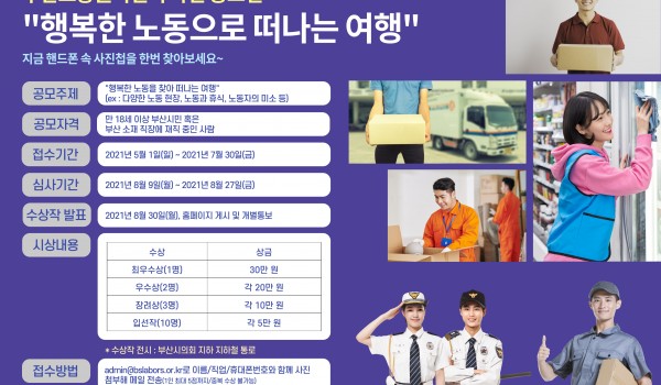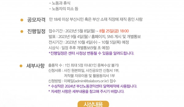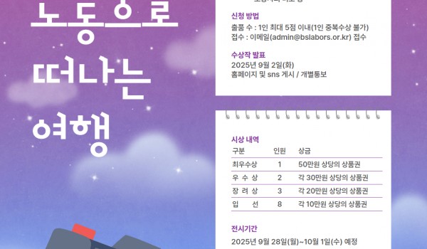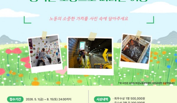 노동사진 공모전 노동수기 공모전 기타 노동사진 공모전 2026 부산노동권익센터 사진 공모전 "행복한 노동으로 떠나는 여행" 2026 부산노동권익센터 사진 공모전 "행복한 노동으로 떠나는 여행"노동의 소중한 가치를 사진 속에 담아주세요!○ 접수기간.. 최고관리자 04-21 18 노동사진 공모전 2025년 사진전 전시회 2025년 노동사진 공모전 수상작 전시회 일정 : 2025.10.21(화)~23(목) 10:00~16:00장소 .. 부산노동권익센터 10-17 367 노동사진 공모전 [수상자 공지] 2025 부산노동권익센터 노동 사진 공모전 부산노동권익센터 08-22 458 노동사진 공모전 2025 노동사진 공모전 "행복한 노동으로 떠나는 여행" 부산노동권익센터 05-02 921 노동사진 공모전 (온라인 사진전) 제 4회 부산노동권익센터 노동 사진전 "행복한 노동으로 떠나는 여행" 부산노동권익센터 온라인 노동사진전"행복한 노동으로 떠나는 여행" 부산노동권익센터에서 주최한 노동사진공모전의 수상작.. 부산노동권익센터 09-09 953 노동사진 공모전 제4회 부산노동권익센터 노동사진전 <행복한 노동으로 떠나는 여행> 2024 부산노동권익센터 노동사진전"행복한 노동으로 떠나는 여행"센터 공모전 수상작들로 꾸며진 노동사진전이9/11~13 남.. 부산노동권익센터 08-27 1013 노동사진 공모전 [수상자 공지] 2024 부산노동권익센터 노동 사진 공모전 부산노동권익센터 08-20 994 노동사진 공모전 2024 부산노동권익센터 노동사진 공모전 “행복한 노동으로 떠나는 여행” 부산노동권익센터 04-30 2016 노동사진 공모전 제 3회 부산노동권익센터 노동 사진전 "행복한 노동으로 떠나는 여행" (온라인 사진전) <부산노동권익센터 노동사진전 - 온라인 사진전>부산노동권익센터 제 3회 노동사진전 "행복한 노동으로 떠나는 여행.. 부산노동권익센터 09-26 1370 노동사진 공모전 제3회 부산노동권익센터 노동사진전 <행복한 노동으로 떠나는 여행> 제3회 부산노동권익센터 노동사진전<행복한 노동으로 떠나는 여행>센터 노동사진공모전이 3회차를 맞았습니다. 그 동.. 부산노동권익센터 09-08 1266 노동사진 공모전 [수상자 공지] 2023 부산노동권익센터 노동 사진 공모전 부산노동권익센터 제3회 노동사진공모전 수상작을 공지합니다.올해도 많은 분들이 소중한 사진을 출품해주셨는데요. 응모해주신 모.. 부산노동권익센터 09-04 1262 노동사진 공모전 2023 부산노동권익센터 노동사진 공모전 “행복한 노동으로 떠나는 여행” 부산노동권익센터 05-08 1897 노동사진 공모전 제 2회 부산노동권익센터 노동 사진전 "행복한 노동으로 떠나는 여행" (온라인 사진전) <부산노동권익센터 노동사진전 - 온라인 사진전>부산노동권익센터 제 2회 노동사진전 "행복한 노동으로 떠나는 여행.. 부산노동권익센터 09-13 1221 노동사진 공모전 [수상자 공지] 2022 부산노동권익센터 노동 사진 공모전 부산노동권익센터 08-17 1202 노동사진 공모전 2022 부산노동권익센터 노동사진 공모전 “행복한 노동으로 떠나는 여행” 부산노동권익센터 05-02 2178 노동사진 공모전 [제1회 노동사진전] 행복한 노동으로 떠나는 여행 부산노동권익센터 09-08 861 노동사진 공모전 [수상자 공지] 2021 부산노동권익센터 사진 공모전 “행복한 노동으로 떠나는 여행” 부산노동권익센터 사진 공모전 "행복한 노동으로 떠나는 여행"에 작품이 선정된 분을 공지합니다.선정된 작품은 9/15(수)~.. 부산노동권익센터 08-12 897 노동사진 공모전 [공모전] 2021 부산노동권익센터 사진 공모전 “행복한 노동으로 떠나는 여행” 부산노동권익센터 05-03 1983