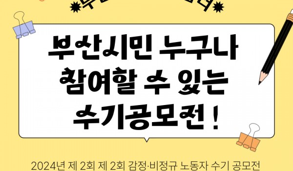 노동사진 공모전 노동수기 공모전 기타 노동수기 공모전 부산노동권익센터 2026년 제4회 감정·비정규 노동자 수기공모전 “일이 글이 되는 순간” 부산노동권익센터 03-24 91 노동수기 공모전 (E-BOOK, 오디오북) 부산노동권익센터 2025년 제 3회 감정·비정규 노동자 수기공모전 “ 일이 글이 … 부산노동권익센터는 2025년 제3회 감정·비정규 노동자 수기공모전의 결과물을 바탕으로 한수기집 오디오북 및 e-Book 출.. 부산노동권익센터 12-10 247 노동수기 공모전 [감정·비정규 노동자 수기 공모전 심사 결과 발표 일정 안내] [감정·비정규 노동자 수기 공모전 심사 결과 발표 일정 안내]안녕하세요.감정·비정규 노동 수기 공모전에 참여해 주신 모든 .. 부산노동권익센터 08-11 552 노동수기 공모전 부산노동권익센터 2025년 제 3회 감정·비정규 노동자 수기공모전 “ 일이 글이 되는 순간 ” 부산노동권익센터 2025년 제 3회 감정·비정규 노동자 수기공모전 “ 일이 글이 되는 순간 ” 부산노동권익센터 04-21 1605 노동수기 공모전 (E-BOOK, 오디오북) 부산노동권익센터 2024년 제 2회 감정·비정규 노동자 수기공모전 “ 일이 글이 … 부산노동권익센터 2024년 제 2회 감정비정규 노동자 수기집을E-BOOK과 오디오북으로 만나보실 수 있습니다!부산노동권익센.. 부산노동권익센터 01-08 796 노동수기 공모전 부산노동권익센터 2024년 제 2회 감정·비정규 노동자 수기공모전 “ 일이 글이 되는 순간 ” 부산노동권익센터 02-29 1764