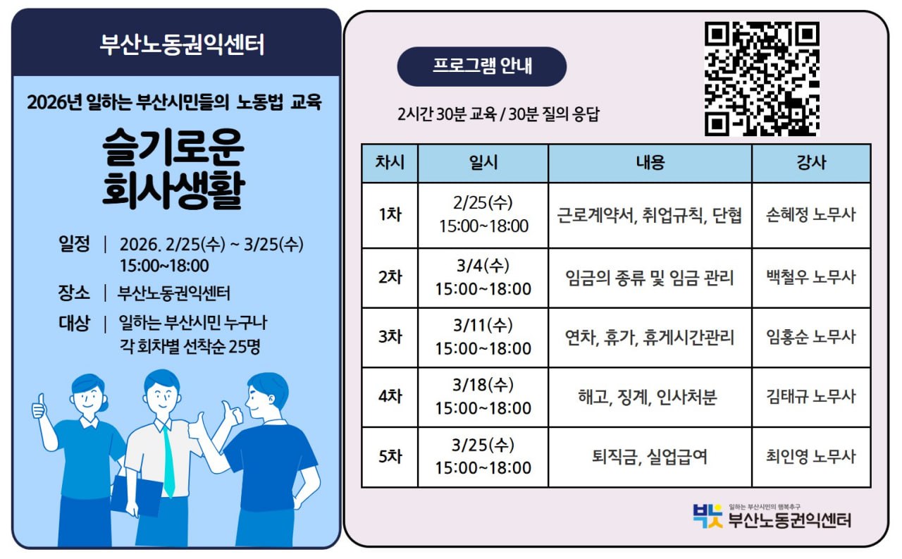 구글신청 2026년 일하는 부산시민 대상 노동법 교육 <슬기로운 회사생활> 목록 본문 신청기간 2026-01-14 ~ 2026-02-24 교육기간 2026-02-25 ~ 2026-03-25 교육시간 15:00~18:00 교육장소 부산노동권익센터 강좌 신청 이름 생년월일 휴대폰 번호 이메일 현재 하시는 일 신청경로 노동인권교육관련 경험 입력 본 사업의 기관(부산노동권익센터)은 개인정보를 중요시하며, <정보통신망 이용촉진 및 정보보호 등에 법률> 및 <개인 정보보호법>에 관한 법률을 준수하고 있습니다.본 기관에서는 수집한 개인 정보(성명, 전화번호)를 법률에서 정하는 경우를 제외하고는 귀하의 동의 없이 제 3자에게 제공하지 않으며, 교육 일정 안내와 활동 진행 외에 다른 용도로는 활용하지 않습니다. 동의합니다. 과정소개 강의목차 ▶ 과정소개 ※ 아래 바로가기 클릭하여 폼 작성 후 접수 부탁드립니다!신청 바로가기 클릭 과정소개 강의목차 차시 강의명 다음글2025 조직문화워크숍 25.09.18
