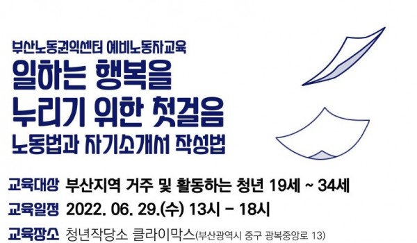 사이트맵 소개 인사말 센터 소개 조직도 주요연혁 오시는길 사업 한눈에 보기 사업 안내 노동 교육 교육 이용안내 단체교육 신청 강좌 신청 온라인 교육 노동법률상담 노동법률상담 이용안내 온라인 상담 (일반) 온라인 상담 (청소년) 방문예약 자주 묻는 질문 동네방네 노무사 동네방네 노무사 사업 소개 사업주 컨설팅 신청 노동안전 노동안전 사업 소개 집단상담 신청 개인상담 신청 자료 발간 자료 이슈페이퍼 정책연구보고서 정책연구결과 인포그래픽 기타 미디어 자료 카드뉴스 웹툰 기타 영상 자료 토론회 노동머선129 서포터즈단 기타 일반자료 노동연구 톺아보기 기타 시민참여활동 공모전 노동사진 공모전 노동수기 공모전 온라인 사진전 기타 캠페인 캠페인 이벤트 온라인 캠페인 기타 알림 공지사항 센터소식 업무협약 좌담회|토론회 이모저모 기타 언론소식 노동뉴스 언론 속 센터 기타 보도자료