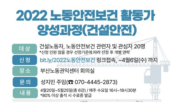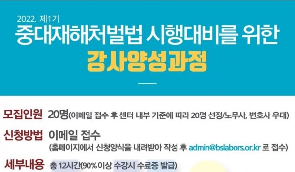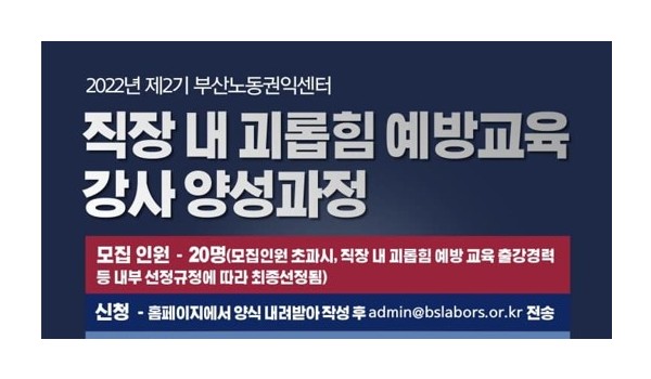 교육 이용안내 단체교육 신청 강좌 신청 온라인 교육 접수중 접수마감 진행예정 구글신청 접수마감 2025 조직문화워크숍 교육기간 2025-09-12 ~ 2025-09-12 접수마감 접수마감 2025년 법규/상담 활동가 및 전문가 역량강화교육 교육기간 2025-04-28 ~ 2025-04-28 접수마감 접수마감 2024 조직문화 워크숍 - 중간관리자 교육기간 2024-04-25 ~ 2024-04-25 접수마감 접수마감 2024 조직문화 워크숍 - 관리자 교육기간 2024-04-12 ~ 2024-04-12 접수마감 접수마감 2023 조직문화워크숍. 변화하는 조직을 위한 A to Z 교육기간 2023-06-30 ~ 2023-07-07 접수마감 접수마감 [예비노동자교육] 가득 채우고 싶은 당신의 지갑 워크숍 교육기간 2022-08-27 ~ 2022-08-27 접수마감 접수마감 2022 노동안전보건 활동가 양성과정(건설안전) 교육기간 2022-04-20 ~ 2022-05-25 접수마감 접수마감 제2기 청소년노동인권강사 양성과정 교육기간 2022-04-05 ~ 2022-05-06 접수마감 접수마감 2022. 제2기 직장 내 괴롭힘 예방교육 강사 양성과정 교육기간 2022-03-03 ~ 2022-06-30 접수마감 접수마감 2022. 제1기 중대재해처벌법 시행대비를 위한 강사양성과정 교육기간 2022-02-10 ~ 2022-03-05 접수마감 접수마감 예비노동자 힐링프로그램 교육기간 2021-12-22 ~ 2021-12-22 접수마감 접수마감 예비노동자 정기교육 교육기간 2021-11-09 ~ 2021-11-09 접수마감 접수마감 2021 민간위탁기관 사업주교육 교육기간 2021-10-15 ~ 2021-12-17 접수마감 접수마감 힐링과 치유를 위한 미술치료(의료계 종사자 대상) 교육기간 2021-10-30 ~ 2021-11-06 접수마감 접수마감 힐링과 치유를 위한 미술치료(보육 돌봄 종사자 대상) 교육기간 2021-10-30 ~ 2021-11-06 접수마감 접수마감 돌봄노동자를 위한 힐링 프로그램 - 마크라메 도어벨만들기 교육기간 2021-10-13 ~ 2021-11-24 접수마감 접수마감 예비노동자 정기교육(8월) 교육기간 2021-08-24 ~ 2021-08-24 접수마감 접수마감 노동의 시선으로 복지를 바라보다 교육기간 2021-08-13 ~ 2021-08-27 접수마감 접수마감 청년노동난장 "그럼에도 우리는" 교육기간 2021-07-10 ~ 2021-07-10 접수마감 접수마감 예비노동자 정기교육 '취업, CHEER UP!' 교육기간 2021-04-20 ~ 2021-04-20 접수마감 열린1페이지 2페이지 맨끝
