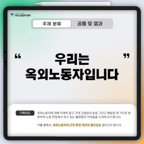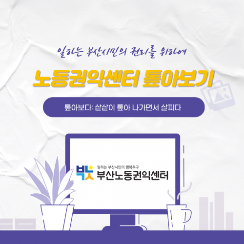 사이트맵 소개 인사말 센터 소개 조직도 주요연혁 오시는길 사업 한눈에 보기 사업 안내 노동 교육 교육 이용안내 단체교육 신청 강좌 신청 온라인 교육 노동법률상담 노동법률상담 이용안내 온라인 상담 (일반) 온라인 상담 (청소년) 방문예약 자주 묻는 질문 동네방네 노무사 동네방네 노무사 사업 소개 사업주 컨설팅 신청 노동안전 노동안전 사업 소개 집단상담 신청 개인상담 신청 자료 발간 자료 이슈페이퍼 정책연구보고서 정책연구결과 인포그래픽 기타 미디어 자료 카드뉴스 웹툰 기타 영상 자료 토론회 노동머선129 서포터즈단 기타 일반자료 노동연구 톺아보기 기타 시민참여활동 공모전 노동사진 공모전 노동수기 공모전 온라인 사진전 기타 캠페인 캠페인 이벤트 온라인 캠페인 기타 알림 공지사항 센터소식 업무협약 좌담회|토론회 이모저모 기타 언론소식 노동뉴스 언론 속 센터 기타 보도자료
