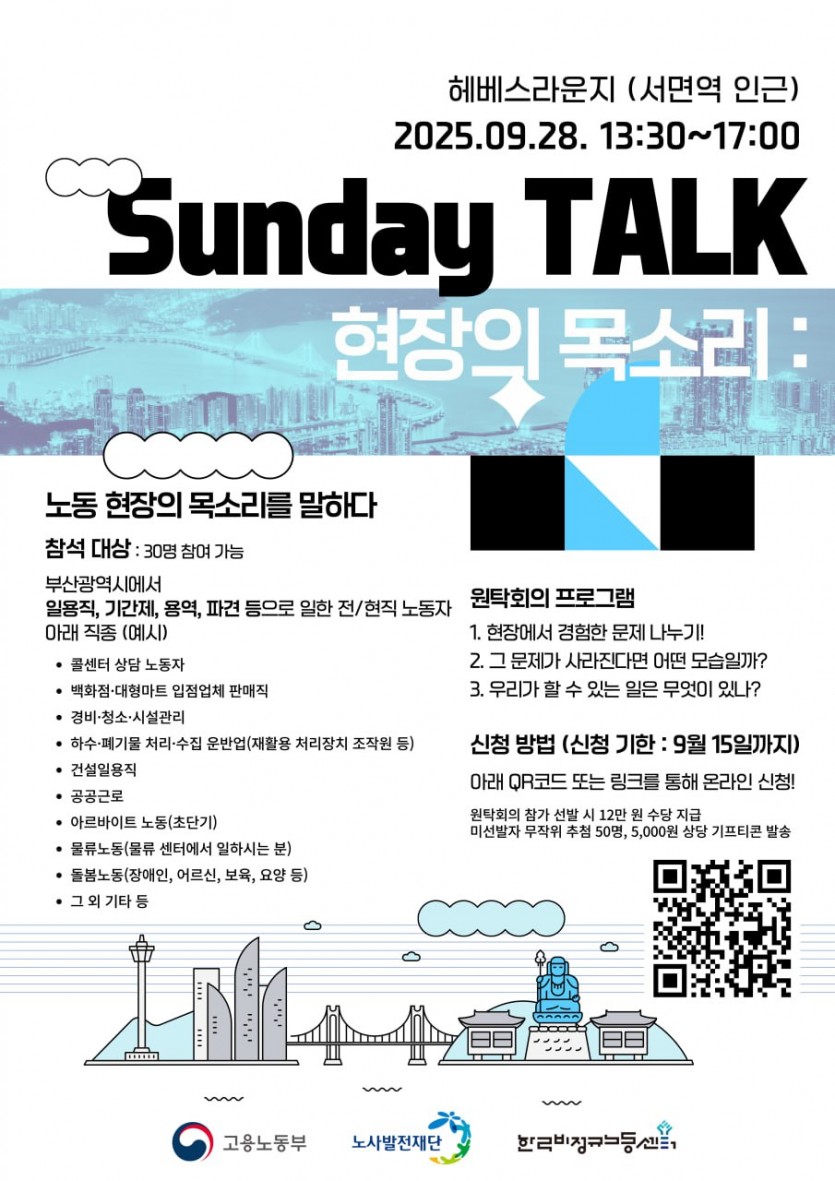 SUNDAY TALK 현장의 목소리 페이지 정보 작성자 부산노동권익센터 댓글 0건 조회 357회 작성일 25-09-09 10:59 목록 본문 https://moaform.com/q/BS_labor_roundtable 첨부파일 일요일_원탁_토크_프로그램_기획부산편.pdf (93.9K) 6회 다운로드 | DATE : 2025-09-09 10:59:21 이전글[10월 북앤토크] 왜 좋은 일자리는 늘 부족한가 25.09.25 다음글2025 부산노동권익센터 제3차 북콘서트 -표명희 작가와 함께 읽는 "어느날 난민", "버샤" 25.08.29 댓글 0 댓글목록 등록된 댓글이 없습니다.
