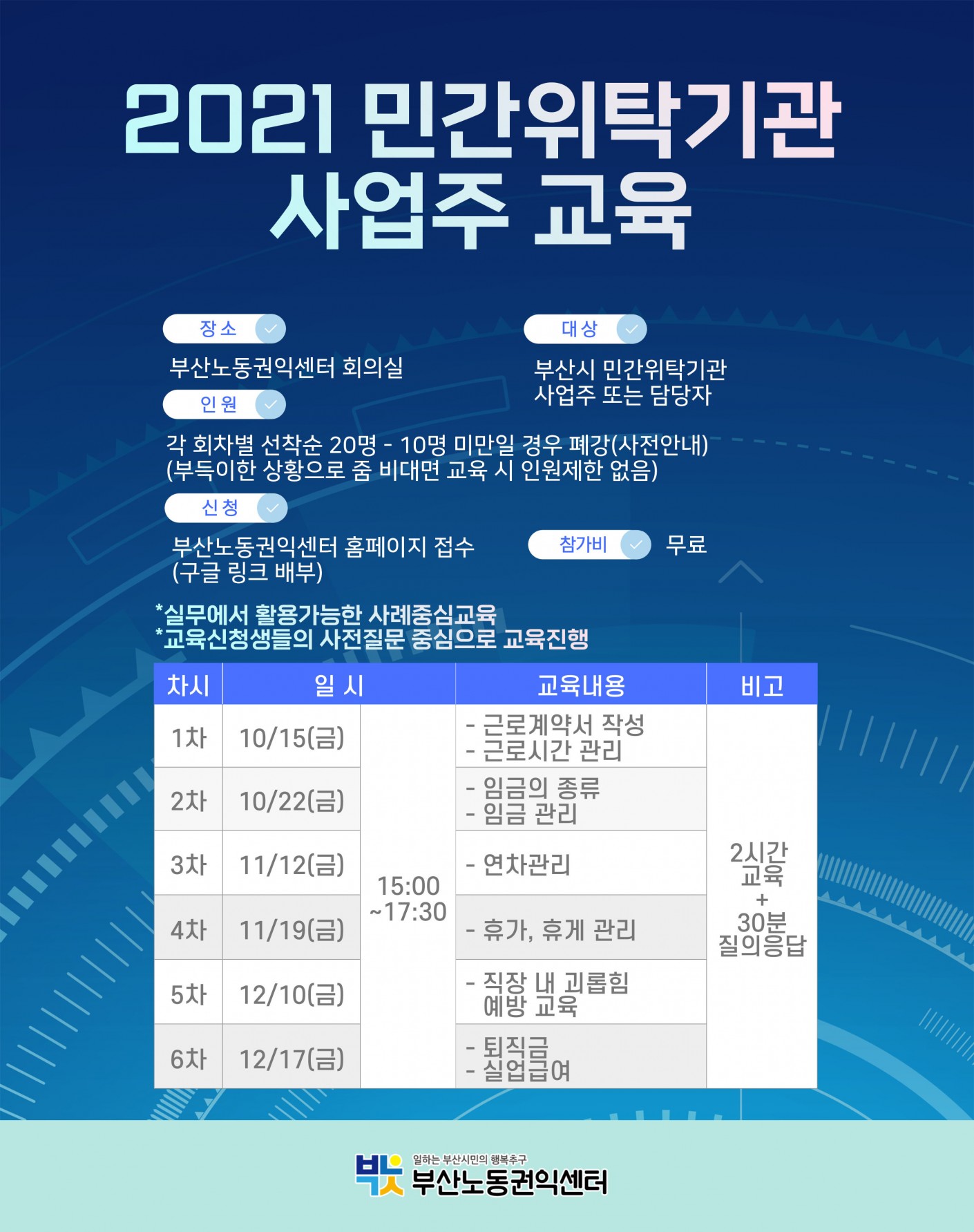 접수마감 2021 민간위탁기관 사업주교육 목록 게시판 리스트 옵션 검색 본문 신청기간 2021-09-24 ~ 2021-11-30 교육기간 2021-10-15 ~ 2021-12-17 교육시간 2시간30분 교육장소 부산노동권익센터 회의실 강좌 신청 이름 생년월일 휴대폰 번호 이메일 현재 하시는 일 신청경로 노동인권교육관련 경험 입력 본 사업의 기관(부산노동권익센터)은 개인정보를 중요시하며, <정보통신망 이용촉진 및 정보보호 등에 법률> 및 <개인 정보보호법>에 관한 법률을 준수하고 있습니다.본 기관에서는 수집한 개인 정보(성명, 전화번호)를 법률에서 정하는 경우를 제외하고는 귀하의 동의 없이 제 3자에게 제공하지 않으며, 교육 일정 안내와 활동 진행 외에 다른 용도로는 활용하지 않습니다. 동의합니다. 과정소개 강의목차 ▶ 과정소개 오른쪽 상단 '접수하기' 대신 아래 구글폼을 통해 신청해주세요. https://bit.ly/민간위탁기관사업주교육 *부산노동권익센터의 모든 교육은 무료입니다. 과정소개 강의목차 차시 강의명 관련링크 https://forms.gle/b2GgjQc61XwH9vad6 1205회 연결 이전글예비노동자 정기교육 21.10.19 다음글힐링과 치유를 위한 미술치료(의료계 종사자 대상) 21.09.07